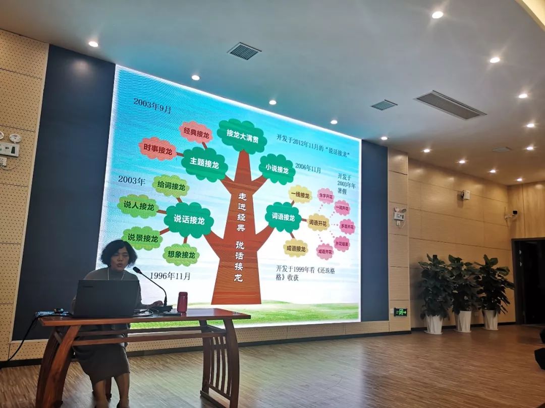 課堂結(jié)束后,丁老師又在階梯教室進(jìn)行了《說(shuō)話接龍之積累、激活、應(yīng)用》的講座,和老師們分享了“生字開花 ”“說(shuō)話接龍”教學(xué)的意義和具體實(shí)施方法。